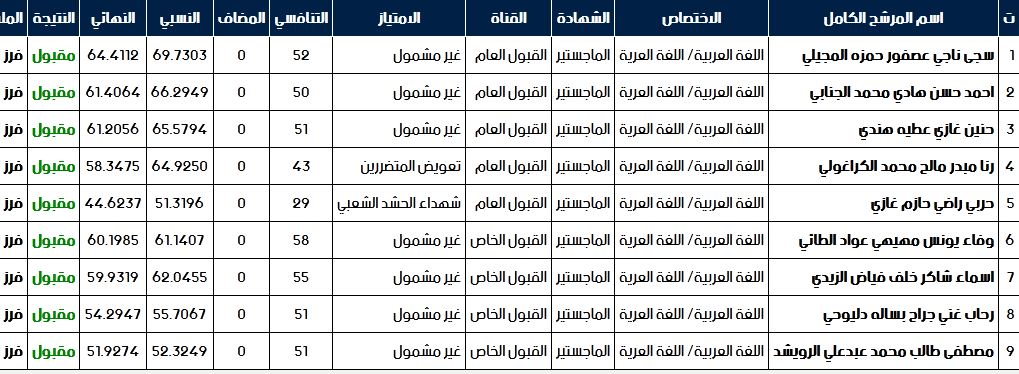 نتائج القبول الاولي للطلبة للمتقدمبن للدراسات العليا في قسم اللغة العربية كلية التربية الاساسية / جامعة واسط للعام الدراسي 2025-2026