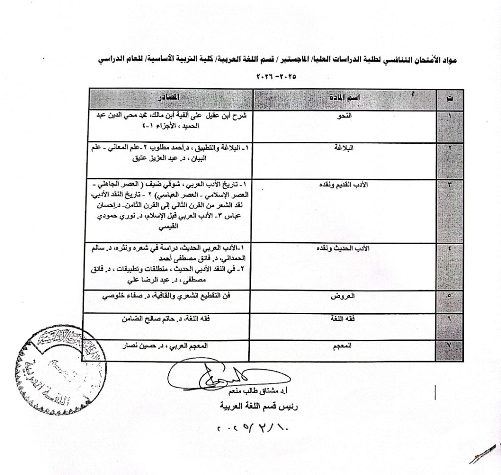 تعلن كلية التربية الأساسية جامعة واسط عن المواد الامتحان التنافسي للمتقدمين على الدراسات العليا للعام الدراسي 2025-2026.