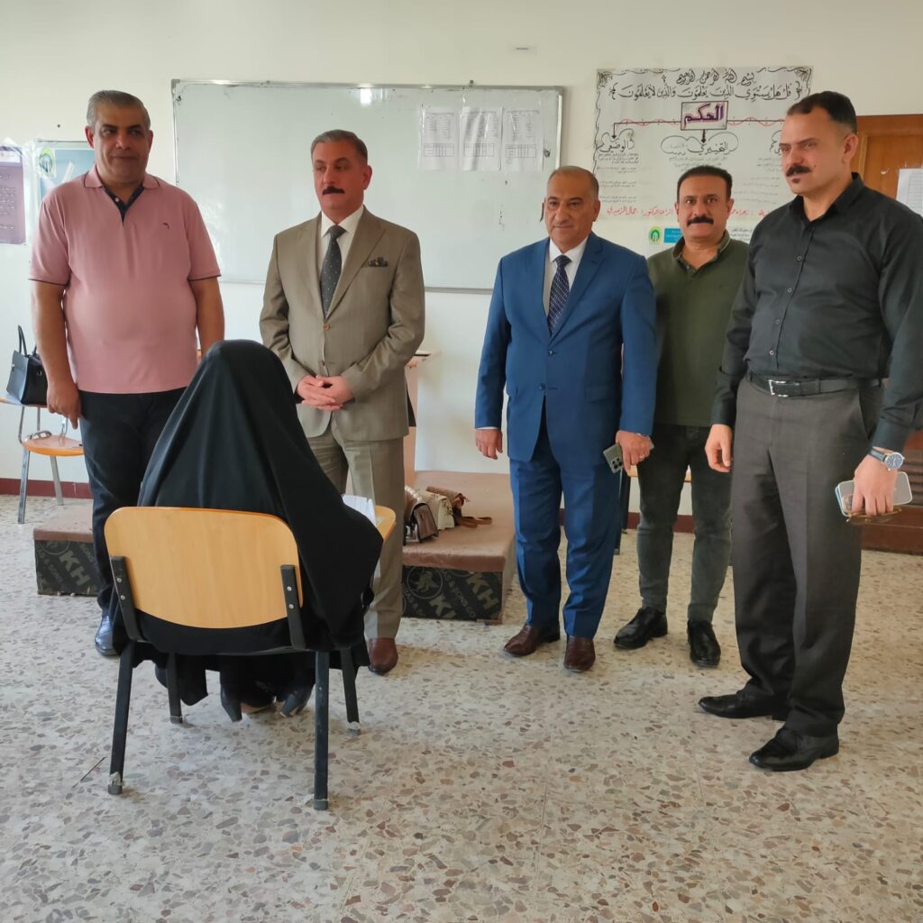 The Dean of the College of Basic Education, Assistant Professor Dr. and the Scientific Assistant review the competitive test for applicants for postgraduate studies at the College of Basic Education